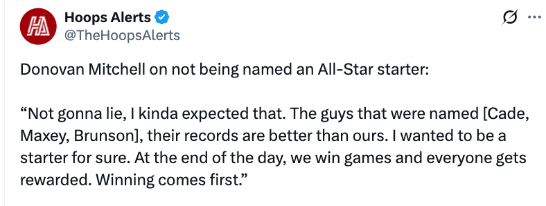 米切尔表示:““说实话,我其实有点预料到了。那些入选首发的球员,他们球队的战绩确实比我们好。我当然想成为首发,但说到底,只要我们赢球,每个人都会得到回报,赢球才是第一位的。”