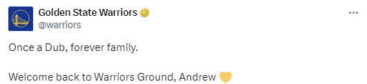 勇士队官方在社交媒体上晒出了相关视频,还配文写道:“一日勇士人,终身一家亲。欢迎回到勇士主场,安德鲁-维金斯!”