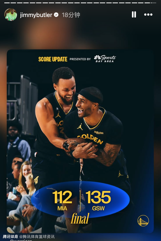2026-01-20 14:20北京时间1月20日,NBA常规赛,勇士在主场以135-112大胜热火,本场比赛巴特勒在第三节伤退离场,不过赛后他依然转发了勇士获胜的海报,和兄弟们一起庆祝这场胜利。