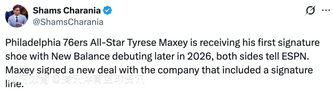 Shams:马克西与新百伦合作推出首款签名鞋 预计今年晚些时候正式发布