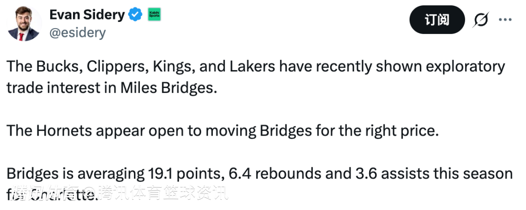 2026-01-21 01:20北京时间1月21日,据美记Evan Sidery报道,雄鹿、快船、国王和湖人近期都对迈尔斯-布里奇斯表达了初步的交易兴趣,而黄蜂队似乎也愿意在价格合适的情况下交易布里奇斯。