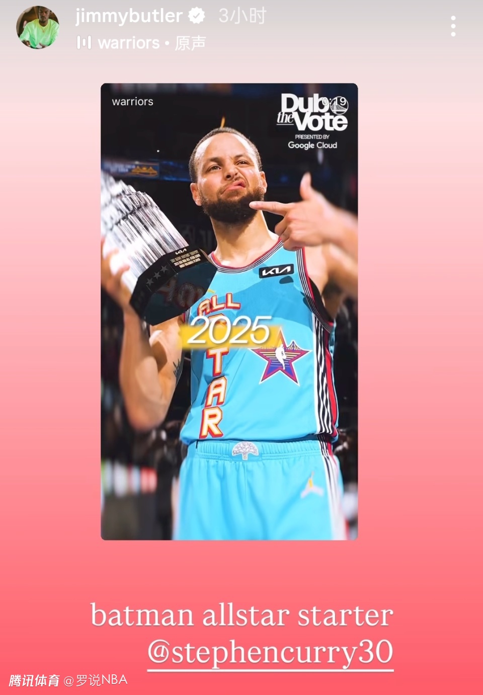 巴特勒还在社媒评论区回应大家:“感谢大家的所有祝福。”另外,在IG的快拍中,他也不忘晒照祝贺库里入选全明星首发,他配文写道:“蝙蝠侠,全明星首发@库里。”