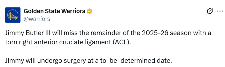 2026-01-21 06:10北京时间1月21日,勇士官方发布声明,前锋吉米-巴特勒因右膝前交叉韧带撕裂,将缺席2025-26赛季的剩余所有比赛。巴特勒是在昨日对阵迈阿密热火的比赛第三节还剩7分41秒时受伤的,勇士队最终以135-112获胜。他将在择期接受手术。