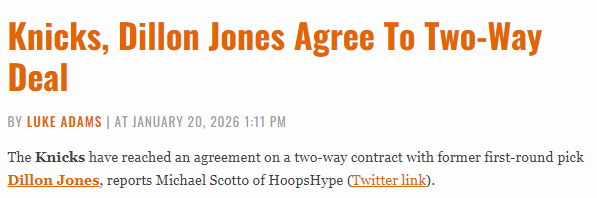 2026-01-21 06:40北京时间1月21日,据记者Michael Scotto报道,尼克斯队已与前首轮秀狄龙-琼斯达成一份双向合同协议。