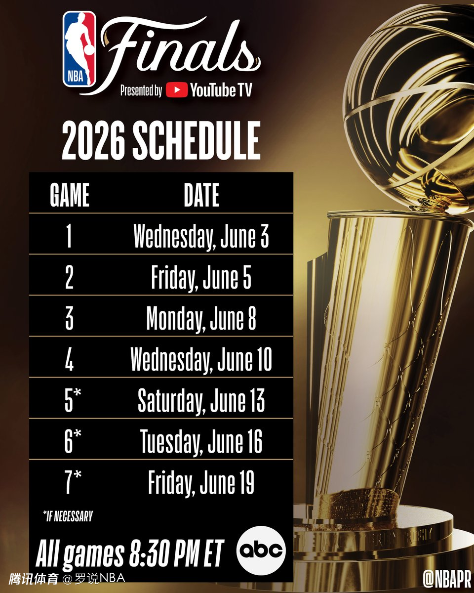 2026-01-21 06:40北京时间1月21日,距离2026年NBA全明星周末还有几周时间,但联盟已经公布了2026年总决赛的赛程,系列赛将于6月4日(北京时间,下同)拉开战幕。