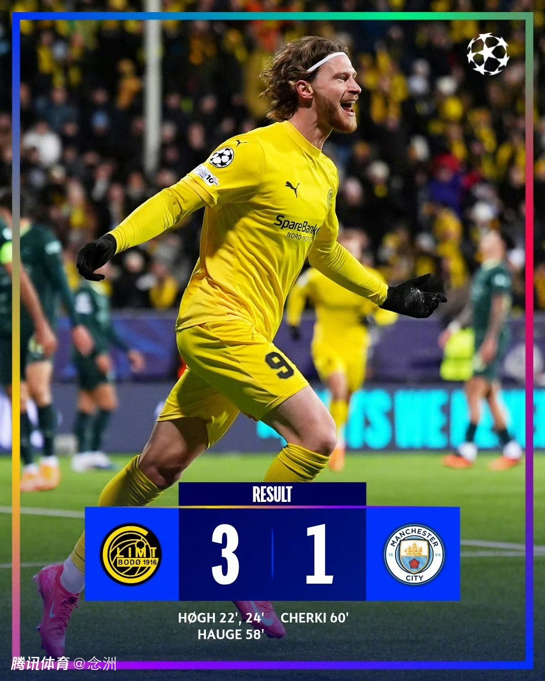 十人曼城客场1-3不敌博德闪耀,各项赛事两连败,博德闪耀取得本赛季欧冠首胜,阿莱恩被断送礼,布隆伯格两送助攻,霍格2分钟梅开二度,海于格世界波再度扩大领先优势,谢尔基扳回一球,罗德里1分钟连吃2黄被罚下。