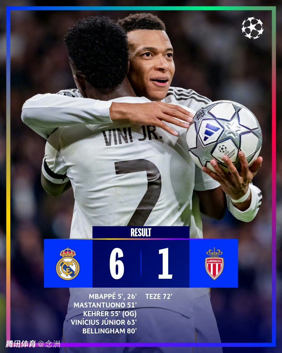 皇马主场6-1摩纳哥,阿韦洛亚取得欧冠首胜,姆巴佩对阵旧主梅开二度,马斯坦托诺打进欧冠处子球,维尼修斯造科雷尔乌龙球随后抽射破门,塞巴略斯失误,特泽推射扳回一城,贝林厄姆单刀建功。