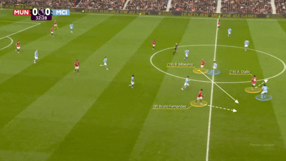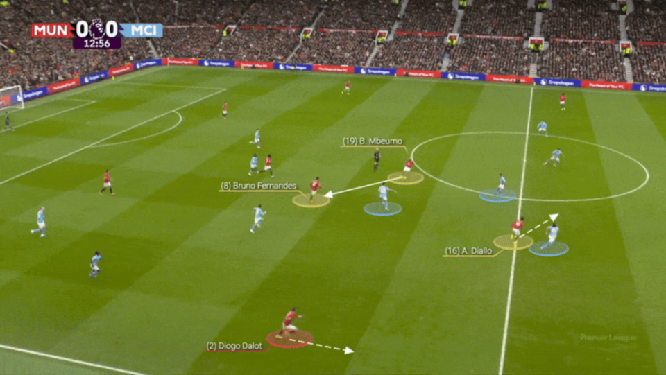 在进攻端,卡里克和教练组安排的无锋阵容,通过不断的换位跑动,利用曼城中场和后卫身后的区域。站在中锋位置的姆贝莫回撤,B费、阿马德·迪亚洛 、帕特里克·多古甚至边卫迪奥古·达洛系统的跑位,不断制造出空当。