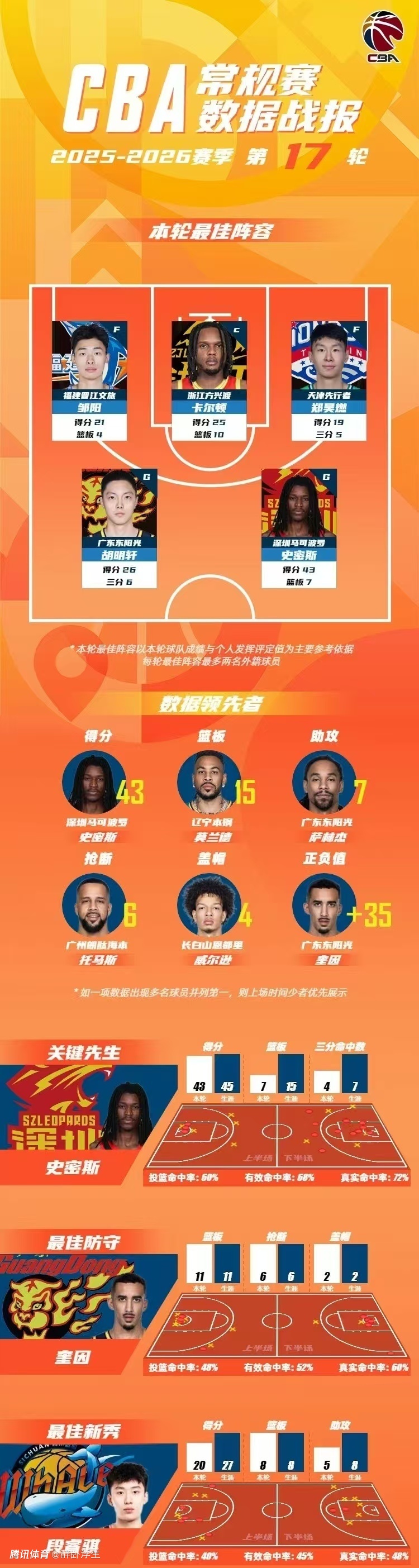 CBA第17轮最佳阵容:胡明轩26+6三分爆发 史密斯43分反绝杀三分