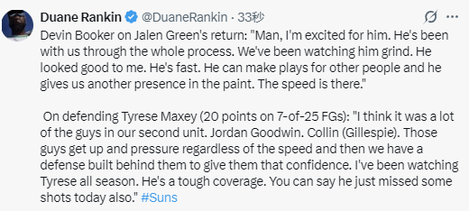 在谈到对于马克西的防守时,布克表示:“我觉得主要是我们第二阵容的几个球员做得好,特别是古德温和吉莱斯皮。不管对手速度多快,他们都能贴上去施压,而且我们身后有整套防守体系支撑,给了他们信心。我整个赛季都在关注马克西,他很难防。当然也得说,他今天也投丢了不少球。”