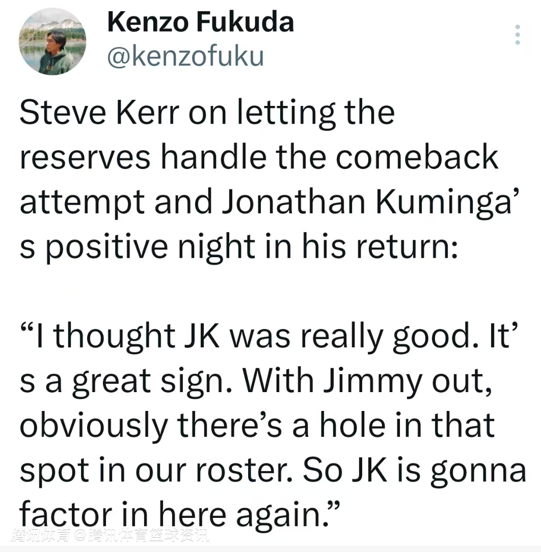 谈到库明加的表现,科尔说道:“我认为库明加今晚的表现非常出色,这是一个极其积极的信号。很明显,随着巴特勒的缺阵,我们球队阵容的这个位置出现了空缺。库明加会再次成为球队的重要一员,他始终保持着待命状态,这一点让我非常满意。”