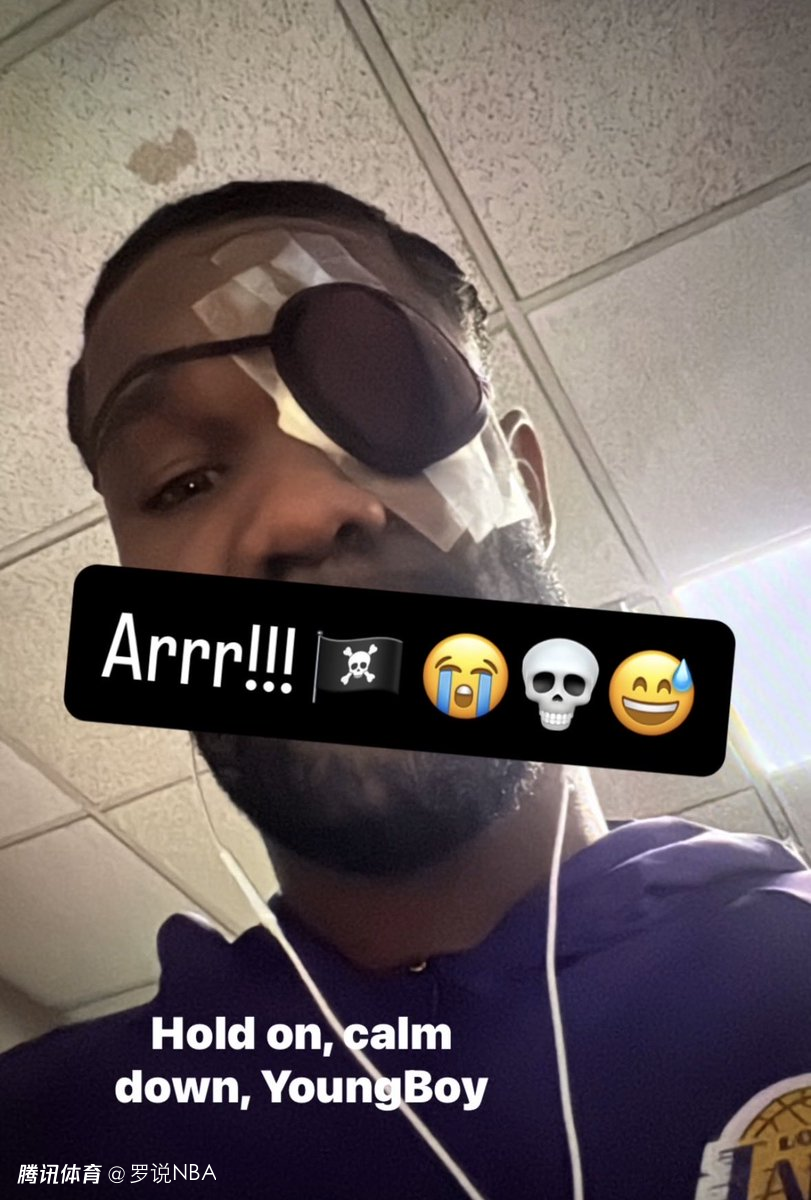 2026-01-21 15:50北京时间1月21日,湖人中锋艾顿更新社媒,晒出了自己今天比赛受伤后的自拍,并配文写道“Arrr!!(海盗旗表情包)!等一下,冷静点,小兄弟!”他的“独眼龙”造型,确实很像海盗。