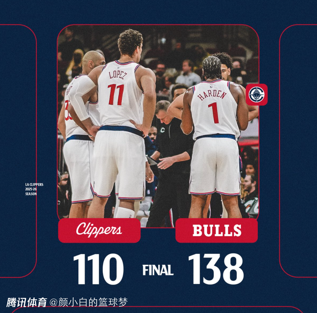 快船队在客场28分惨败公牛,这场比赛泰伦卢提前一节放弃比赛,哈登24分6助攻5篮板6失误,命中率只有36%,36岁的哈登体能明显不支,一波6连胜被终结后快船艰难的稳住了西部第十的位置,但只要输球就会掉出附加赛。