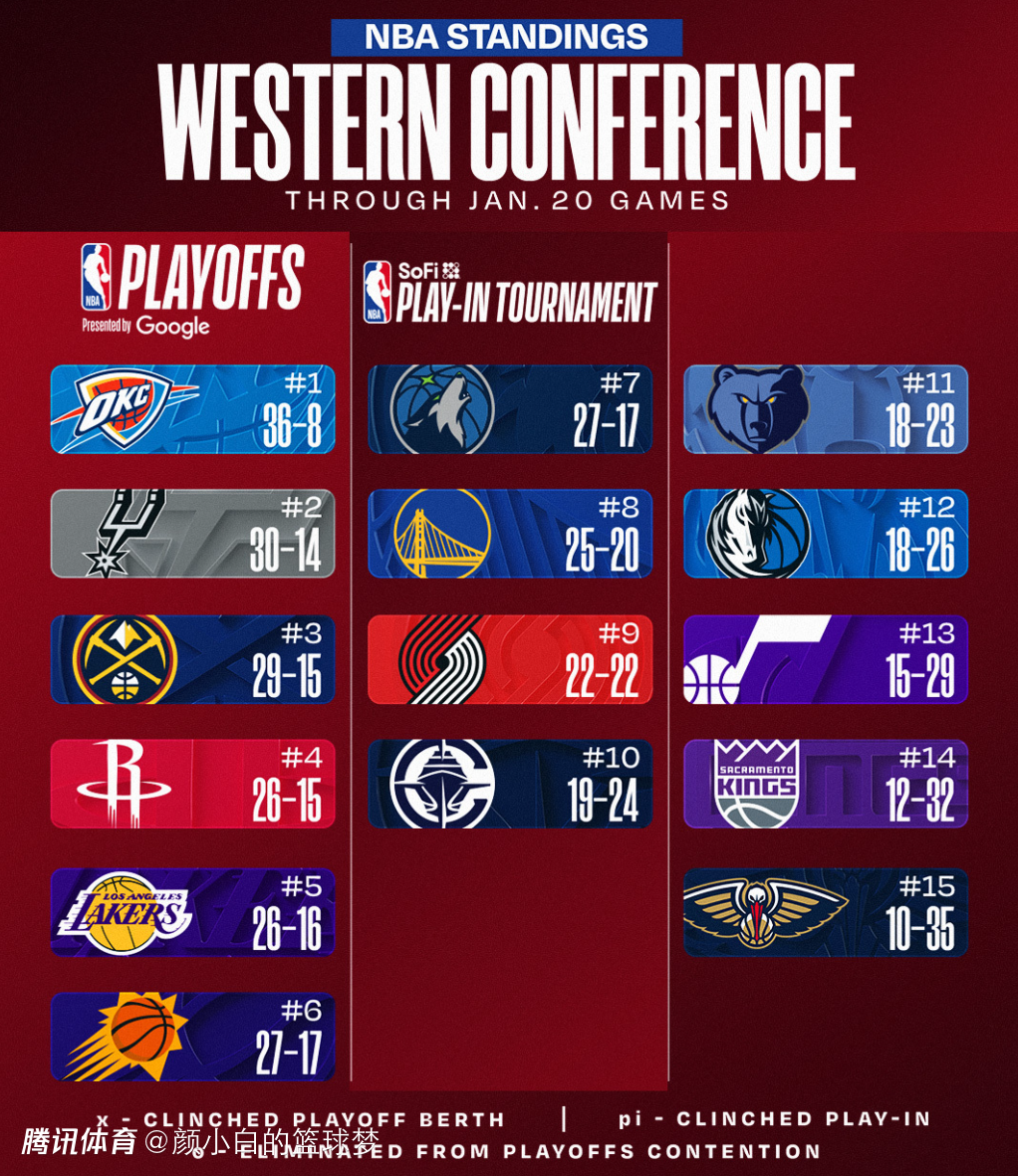 2026-01-21 19:40北京时间1月21日,NBA常规赛打完,西部的格局再度出现了变化,休斯顿火箭队升至第四,洛杉矶湖人升至第五,菲尼克斯太阳升至第六,森林狼则掉到第七,勇士则还是维持第八,快船艰难维持第十。