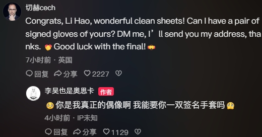 而在李昊帮助球队打进决赛之后,今日切赫现身了李昊在社媒的评论区写道:“祝贺你李昊,精彩的零封!可以给我一双你的签名手套吗?私聊我,我会给你我的地址,谢谢,决赛好运!”