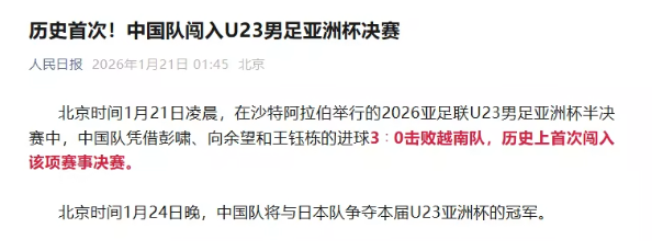 2026-01-21 20:30北京时间1月21日,今日中央电视台《新闻联播》节目中,播报了U23国足击败越南U23,首次闯入U23亚洲杯决赛的新闻。