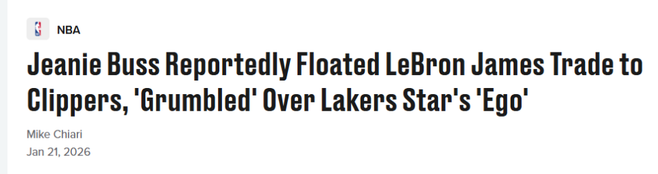 2026-01-21 23:00北京时间1月21日,据ESPN报道,在去年将洛杉矶湖人多数股权出售给马克-沃尔特之前,湖人球队老板珍妮就已对超级球星勒布朗-詹姆斯心生失望。
