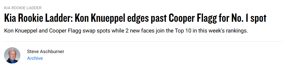 NBA官网新秀榜更新:克努佩尔超越弗拉格登顶 开拓者乐福升至第8