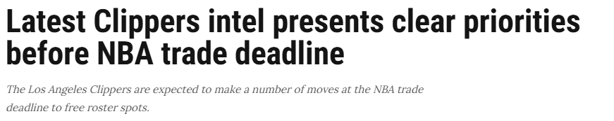 目前快船的薪金总额比第一土豪线硬工资帽低约115万美元,阵中有14名球员持有常规赛季标准合同(小帕特里克-鲍德温为10天短约)。由于桑德斯和米勒的双向合同激活参赛场次即将触顶,快船需要送走这14名正式合同球员中至少一人,才能为两人腾出阵容位置。