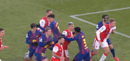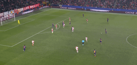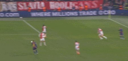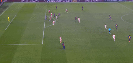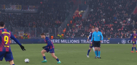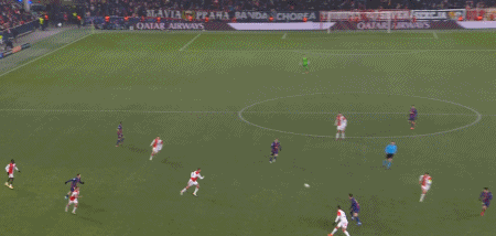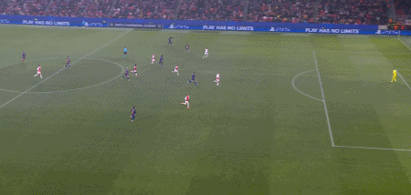 第34分钟,德容直塞,费尔明禁区右侧小角度抽射,门将扑挡后球依然折射入网,1-1。