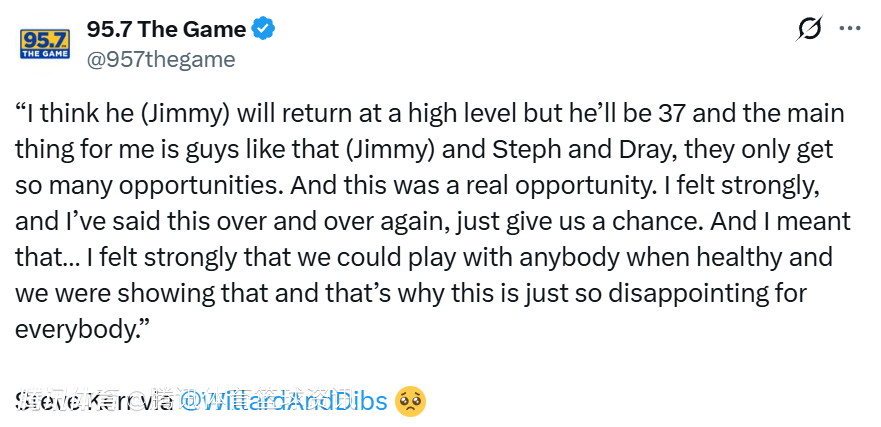 科尔说道:“我相信巴特勒伤愈归来后依旧能打出高水平表现,但届时他就37岁了。对我而言,关键在于,巴特勒、库里、追梦这类球员,职业生涯能把握的争冠机会本就寥寥无几,而这次本就是一次绝佳的机会。”