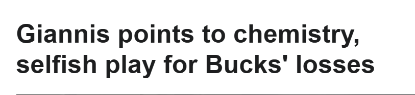字母哥说道:“我们打得毫无拼劲,一点拼劲都没有。我们总在做无用功,打球毫无求胜欲。团队也毫无配合,全队毫无化学反应。还有人打球太独,一门心思只想着自己出手,眼里根本没有球队,不知道为团队打合理的球,个个都想着单干。”