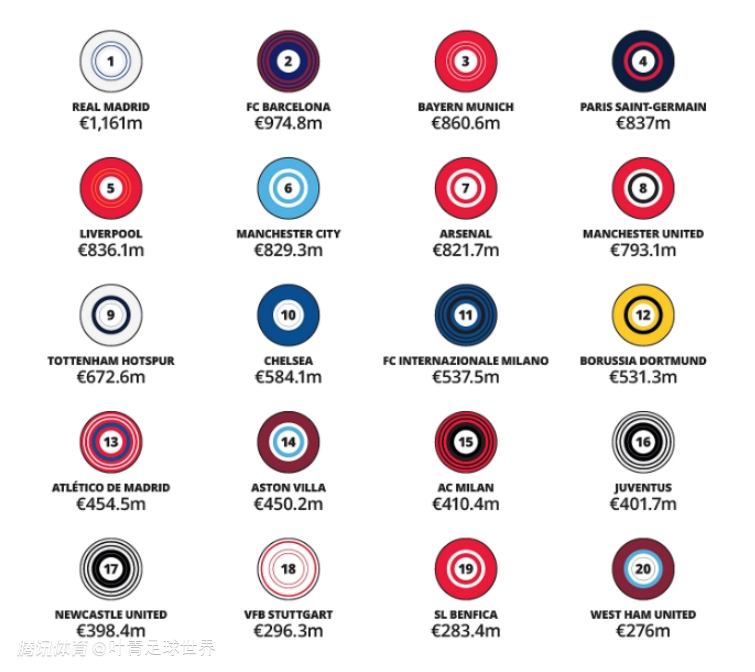 利物浦以8.36亿欧元的总收入,排名总榜单第5位、英超俱乐部第1位。曼城的总收入为8.293亿欧元,排名第6位;阿森纳8.217亿欧元排名第7,曼联则下滑4位,从第4跌至第8位。热刺、切尔西两家伦敦俱乐部,分列9-10位。