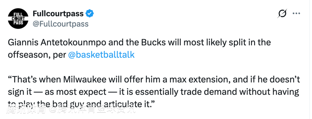 “雄鹿队届时将不得不交易他,否则就会面临在2027年夏天白白失去他的风险(届时快船、热火等球队都将腾出薪资空间,等待签下他)。当然,扬尼斯也有可能将这份续约合同作为筹码,迫使雄鹿队升级阵容(就像他此前在续约节点时,球队为他交易来霍勒迪,之后又换来利拉德那样),然后再与球队续约。但这一次,情况似乎有所不同。”