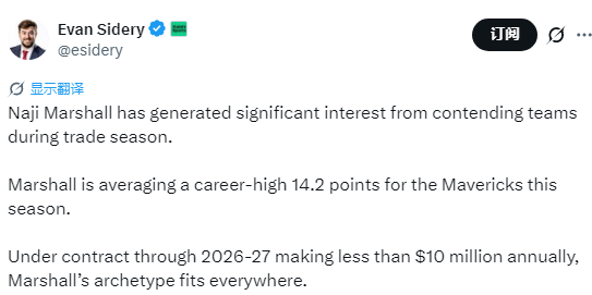 2026-01-23 05:40北京时间1月23日,据记者Evan Sidery报道,在交易窗口期,独行侠球员马绍尔已引发多支争冠球队的高度关注。