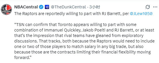 2026-01-23 06:00北京时间1月23日,据记者Josh Lewenberg报道,猛龙方面有意送走RJ-巴雷特。