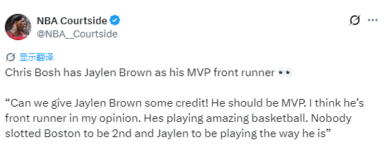 2026-01-23 06:10北京时间1月23日,前NBA球星波什在直播节目中力挺凯尔特人球星杰伦-布朗为MVP头号热门。