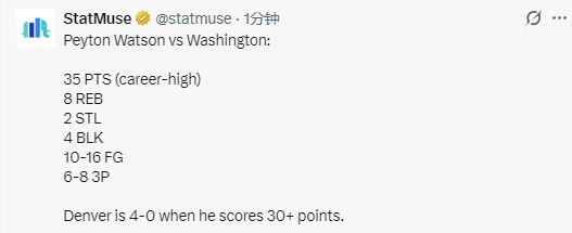 本赛季,当沃特森砍下30+的时候,掘金队4胜0负未尝败绩。