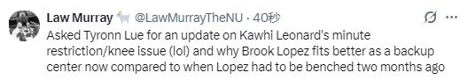 莱昂纳德此役复出,在被问到小卡此役是否有出场时间限制时,卢表示:“我不确定,你们也不确定。”