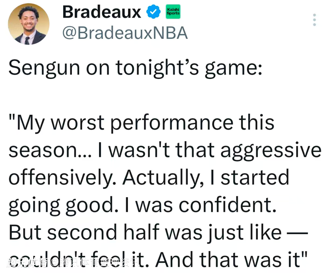 申京:我觉得这是我本赛季打得最差的比赛之一。我在进攻端打得一点都不坚决。其实比赛开局我的状态还不错,当时也很有信心,但到了下半场,就是完全找不到感觉了,情况就是这样。