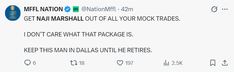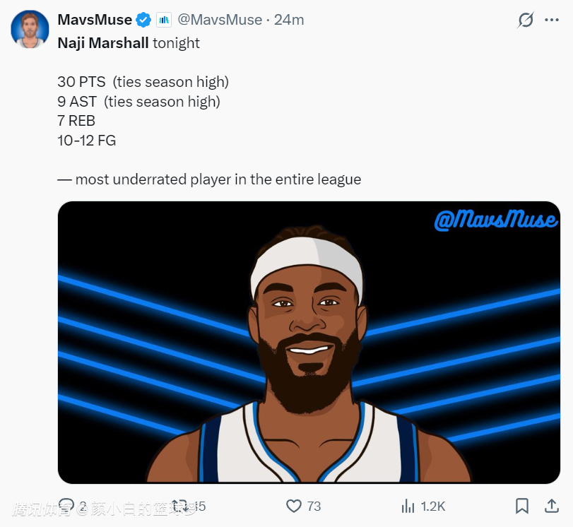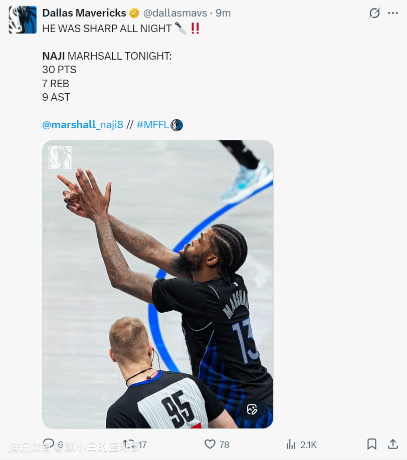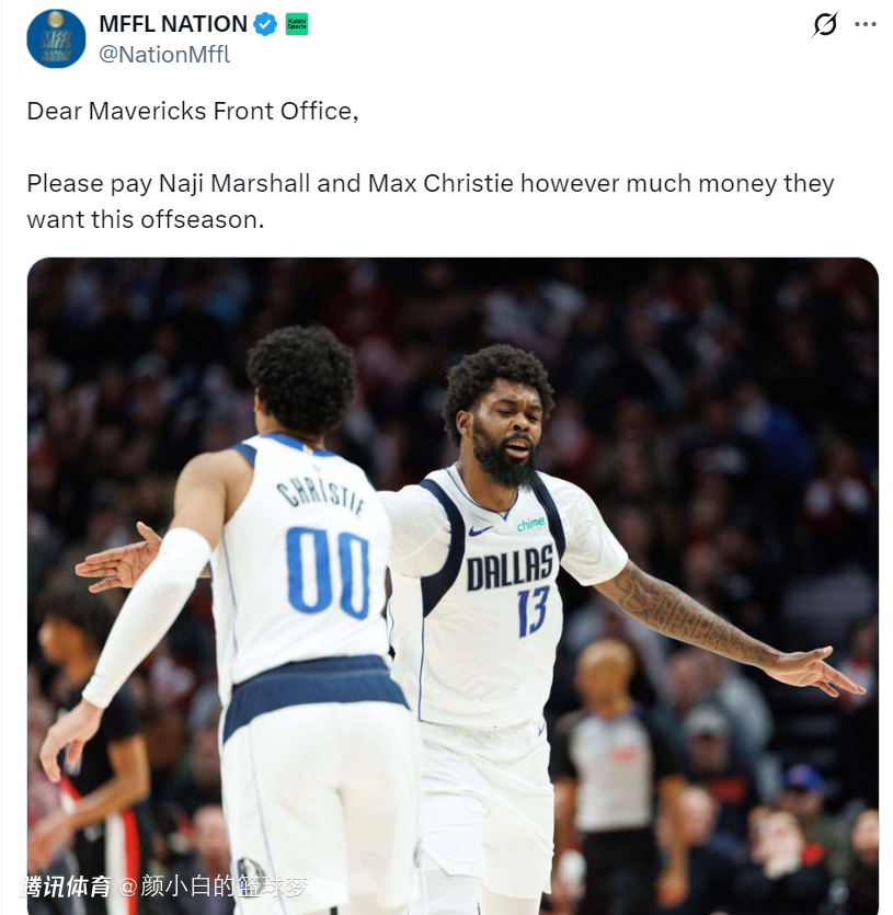 这场比赛后,独行侠媒体MFFL NATION(熟悉独行侠的球迷应该知道他是独行侠死忠),他写道:把马绍尔从你们所有的交易模拟中剔除把,我不在乎你们愿意拿出什么筹码,我们想把他留在达拉斯直到他退休为止。