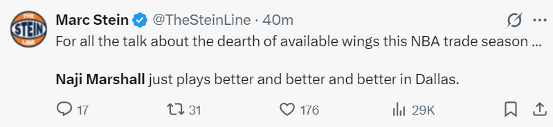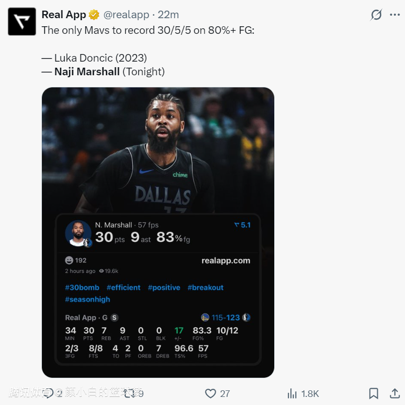 NBA记者马克-斯坦恩:都说联盟的侧翼越来越少,但独行侠的马绍尔表现越来越出色了。