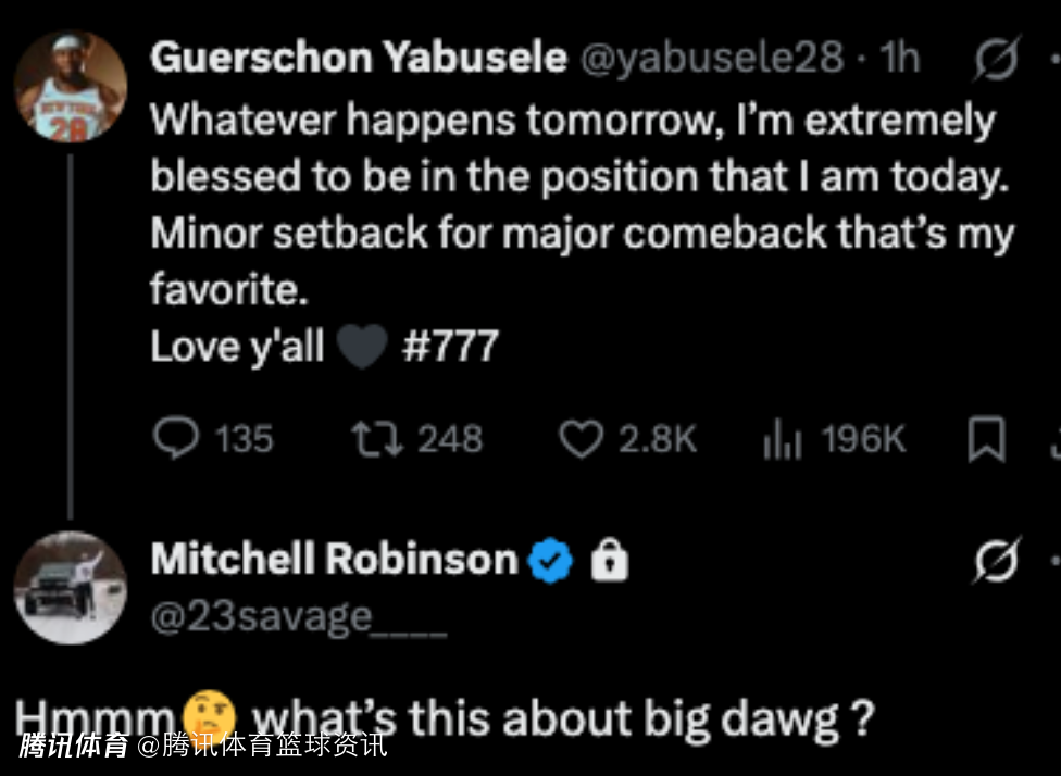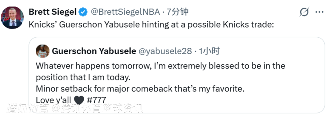 值得一提的是,尼克斯中锋米切尔-罗宾逊也现身评论区:“这是什么情况啊,兄弟。”随后,美记Brett Siegel也转发了亚布塞莱这条动态,写道:“亚布塞莱暗示自己可能会被交易。”