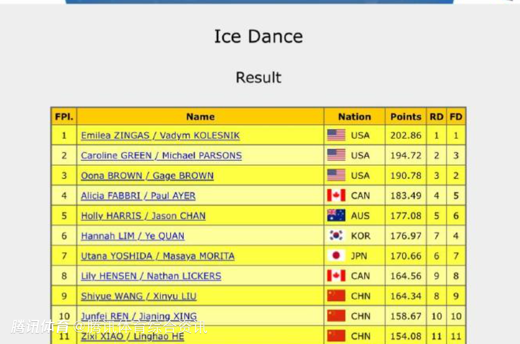 昨天的冰舞韵律舞,王诗玥/柳鑫宇以64.41分排在第8位,年轻组合任俊霏/邢珈宁(61.55分)、肖紫兮/何凌昊(61.26分)分别位列第10位和第11位,美国组合包揽前三。今天的冰舞自由舞,王诗玥/柳鑫宇拿到99.93分,排在第九;任俊霏/邢珈宁获得97.12分,排在第十;肖紫兮/何凌昊获得92.82分,排在第十一。