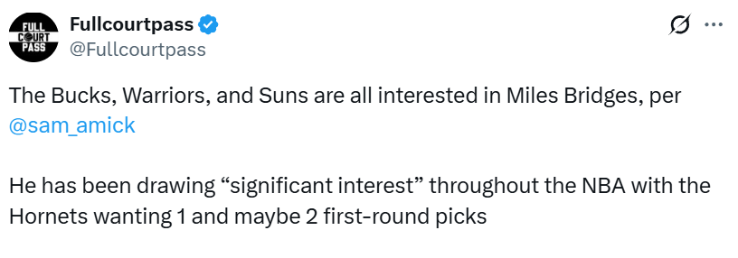勇士等多队追求布里奇斯!黄蜂要价1-2个首轮 库明加大概率成筹码