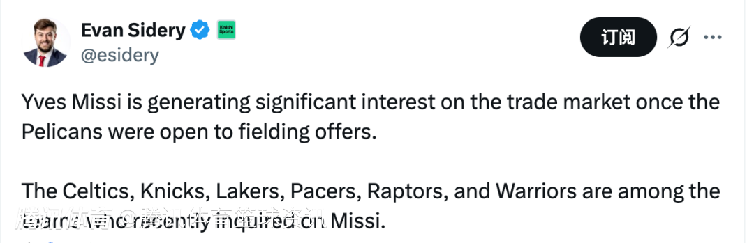 2026-01-24 00:30北京时间1月24日,据美记Evan Sidery报道,自从鹈鹕开始愿意听取报价后,米西在交易市场上引发了多支球队的浓厚兴趣,凯尔特人、尼克斯、湖人、步行者、猛龙和勇士等球队,都在近期询问了关于米西的情况。