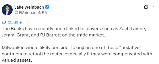 Weinbach表示,雄鹿方面大概率会考虑接手这类溢价合同来重组阵容,尤其是在能获得高价值资产作为补偿的情况下。