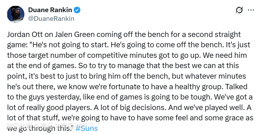 格林将继续替补!太阳主帅:会给他增加一定高强度比赛出场时间