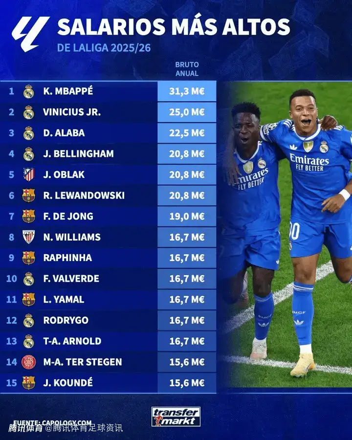 其中,姆巴佩以3130万欧元的年薪高居榜首,成为本赛季西甲收入最高的球员。紧随其后的同样是皇马球员,第二位年薪为2500万欧元,第三名阿拉巴年薪达到2250万欧元,而贝林厄姆则以2080万欧元位列第四。