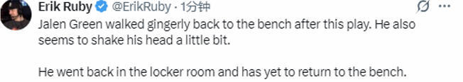 从慢动作回放来看,杰伦-格林在突破上篮成功后,疑似受伤,他一瘸一拐地走向替补席,看起来还轻轻摇了摇头。随后,杰伦-格林返回了更衣室,至今尚未回到替补席。
