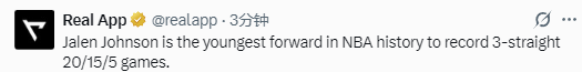 杰伦-约翰逊连续3场至少20+15+5 创NBA锋线球员最年轻纪录