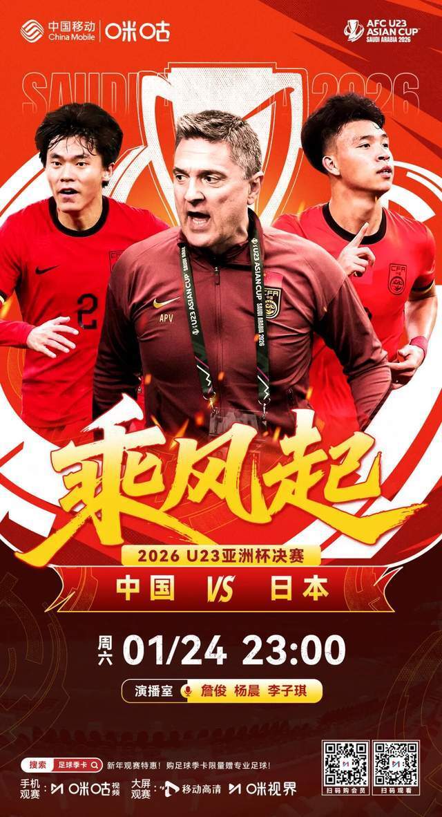 1月24日23:00,锁定咪咕视频、移动高清、咪视界,看2026年U23亚洲杯决赛,让我们并肩浴血,为U23小伙们共同助力!