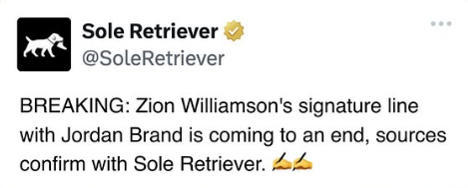 2026-01-24 11:30北京时间1月24日,根据球鞋媒体Sole Retriever报道,乔丹品牌计划在推出锡安4代后,不再给锡安制作专属的个人签名鞋,而他与乔丹品牌的合同将在今年到期,目前也无任何消息或报道显示锡安与乔丹品牌续约。