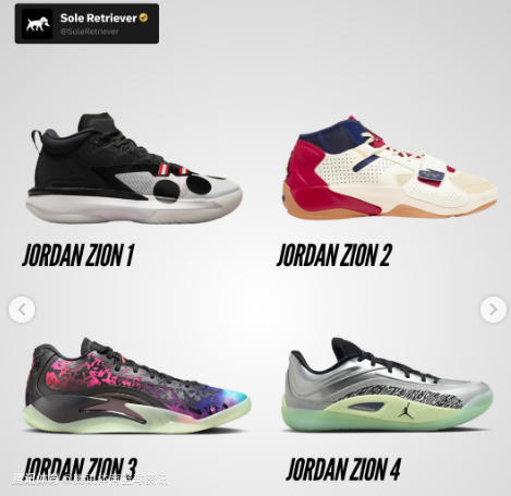 锡安在2019年曾与乔丹签下了一份7年7500万美元的代言合同,他的首款个人签名鞋则在2021年发布,随后乔丹品牌又在2022年推出锡安2代签名鞋,2023年推出锡安3代签名鞋。而最近的锡安4代签名鞋,则是在2025年1月面世。