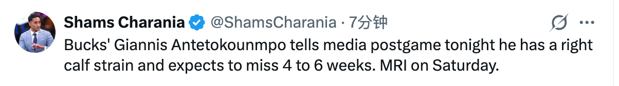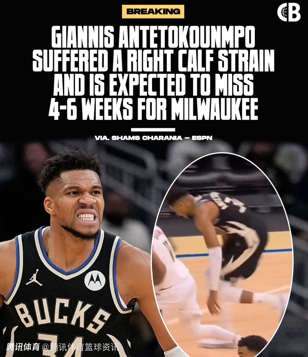 Shams:字母哥赛后亲承右小腿拉伤 预计缺席4-6周