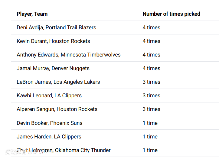 4票:阿夫迪亚、杜兰特、爱德华兹、贾马尔-穆雷